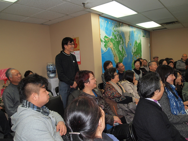 王春杰到场,非常惊讶地发现大家正在观看他的以往历届演出的幻灯照片。在大家的掌声中,他高兴地为大家介绍了照片中的演出内容以及其中各位人物。在主持人的开场致辞后,他又侃侃而谈笛子的不同派系及吹奏特点,并现场演示南派和北派吹奏上的不同之处,以及演奏技法上的“吐、滑、剁、花”等技巧,让所有人对笛子增加了认知。随后的一曲“扬鞭催马运粮忙”把人们带入中国北方农田丰收的意境,也引来了楼内的好几位非华裔朋友入室欣赏。他的演奏具有一种特殊的音乐氛围,能使乐曲旋律的地方特色生动展现,在场的每个人都静静地沉浸在美妙的笛声所带来的意境之中。再接着一曲“兰花花”又将人们带到了陕北一望无际的黄土高坡,悠远高亢的笛声引起无限畅想。又是几首笛子名曲之后,再和学生杨波合奏一曲,而后又现场带领学生吹奏“我是一个兵”,为演出活跃了气氛。王春杰的学生登台坦言:跟王老师学习,每次所得到的哪怕是一点点进步,都是非常幸福的感受,比起物质世界中的所得要珍贵得多。来宾加拿大当代艺术书法协会会长石甫也对王春杰的笛艺由衷赞叹,并称早已仰慕已久,今日终于一见。