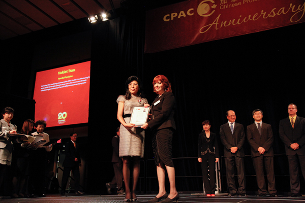 在昨晚的庆典仪式上,主办方为CPAC的五位创始人许谷、章小鸽、王执锐、 陈力、金龙焕颁发了“20周年服务功勋奖牌”,感谢他们将服务专业人士和移民社区的梦想变成了现实;也为CPAC历任的会长、主席颁发感谢奖牌,感谢他们对CPAC 的奉献;还特别将“CPAC终身成就奖”颁发给金龙焕博士,感谢他从1992年CPAC成立至今,对CPAC的不懈努力与付出。