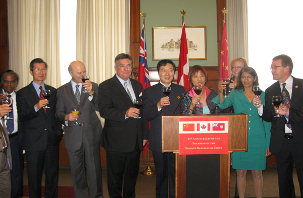 图/贴心姐妹网 在省议会大楼里举行的招待会上,中国驻多伦多总领事房利(中)、省议员黄素梅(右四)、移民及公民厅长苏善民(左四)、旅游文化体育厅长陈国治(左二)和其他省议员举杯祝酒