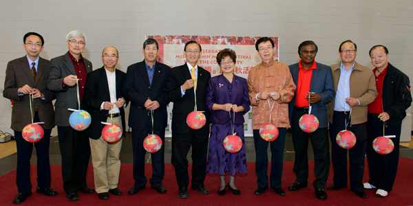 图/大多伦多中华文化中心    出席『千里共婵娟』贺中秋活动的主礼嘉宾:市议员李振光(左二)及赵成俊(左五)、联邦耆老事务国务部长黄陈小萍(左六)及省议员包坚信(右三)