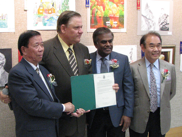 图/安省中国美术会 接收贺函(左起:安省中国美术会会长伍川宇、加拿大国会议员詹嘉礼、安省议员包坚信、安省中国美术会荣誉会长简家驎)