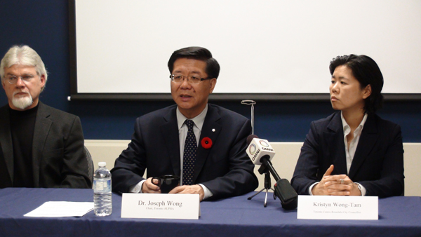 在今天的新闻发布会上,多伦多史维会主席王裕佳医生强调了提高多伦多公众对南京大屠杀认知的意义,以及这段黑暗历史给全人类的警世。