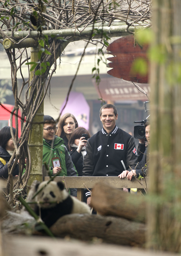 他说:「我们在这里建立的商业往来关系,将为我们与中国的经济联系进行长时间的巩固工作。我们的文化关系也将因此而强化。我们很感谢中国借出宝贵的熊猫落户安省。这个举措深化了安省与中国的友谊,同时提高了安省广大民众对中国丰富文化的兴趣。」