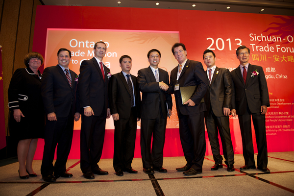 与此同时,贸访团在成都举行了两项合作签约仪式,贸易额总值达6400万加元。省长麦坚迪与四川省代省长魏宏在仪式前举行了正式会晤。麦坚迪在仪式结束后,还前往四川大熊猫繁育基地观赏了憨态可掬的熊猫。