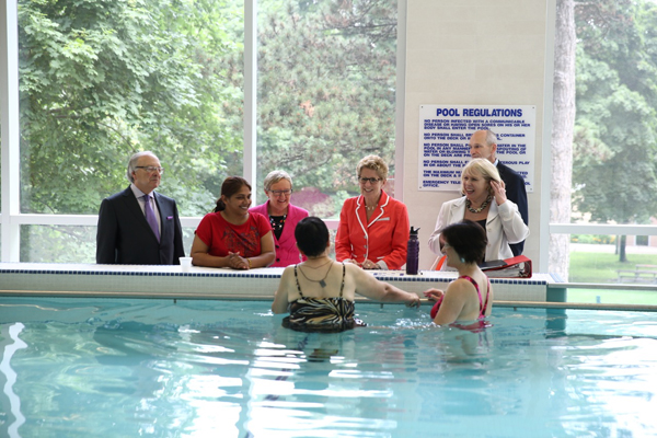 图/省政府 Bridgepoint Hospita医疗大楼新翼今日正式投入服务。省长韦恩(右二)、安省卫生厅厅长马修丝(右)在院方人员的陪同下,参观院内设施,在游泳池旁与康复病人交谈。