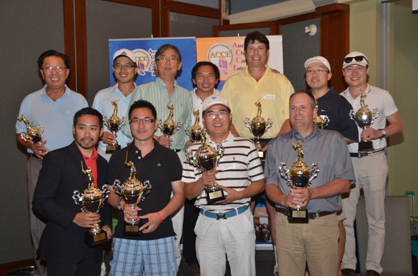 图/创业协进会 2013ACCE高尔夫球赛,四人队制赛冠、亚、季军得主与会长邝国雄(后排左四)合照。(前排由左至右):冠军队成员:石家辉、Dan Yiu、Raymond Wang及 Bill Hood。(后排由左至右) :季军队成员:Kit Wong、Allan Sum、施永辉及亚军队成员:Allan Levy、Jeffrey Sum及Andrew Lee。