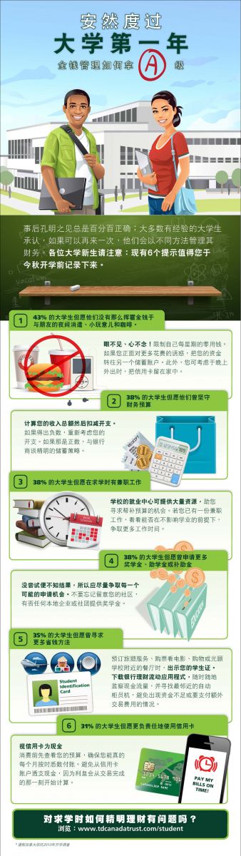 道明加拿大信托高级副总裁Raymond Chun说:“大学充满诱人花钱的机会,所以学生制订一个财务预算,并学习何时和怎样对不能负担的东西说ʻ不ʼ ,是相当重要的。一个学士学位的平均成本,目前估计为8万4千元,学生必须对如何管理日常财务丶善用自己的进修款项和避免负债过多下一番功夫。”