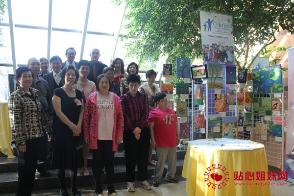 图/贴心姐妹网 智爱中心行政总监梁洁仪(前排左二)、中心会董和中心学员在学员们的作品展览前