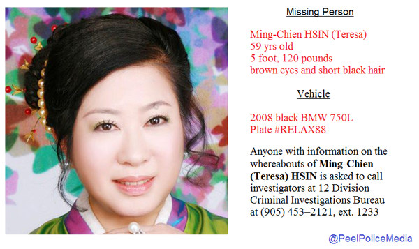 上周四(4月9日),皮尔区警局发出公告,寻找失踪的辛明珊,说人们最后看到她是上周三(4月8日)下午4时30分许在密市Rathburn Road和Hurontario Street一带,她当时可能驾驶一辆2008年的黑色宝马车,牌照是#RELAX88。她当时穿着灰色裙子、黑色紧身裤和红色冬上衣。