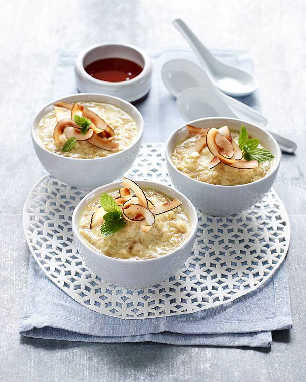 摆放8隻盛载甜品的碗,将糙米布丁舀进每隻碗的中央,填至半满,然后每碗加上一汤匙焦糖放在上面,最后再撒上椰片,即可享用!