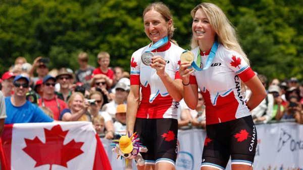 图/Team Canada   加拿大选手Emily Batty (右) 和 Catharine Pendrel 获得泛美运动会女子山地自行车赛金银牌