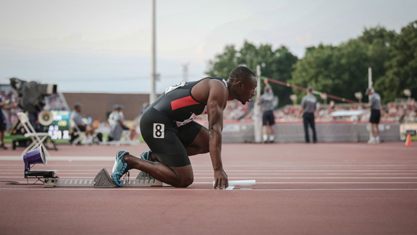 Courtesy of Team Canada    加拿大选手Gavin Smellie在泛美运动会男子4x100米接力赛的起跑线上