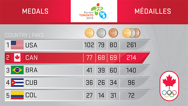 Courtesy of Team Canada    泛美运动会第15日奖牌排行榜