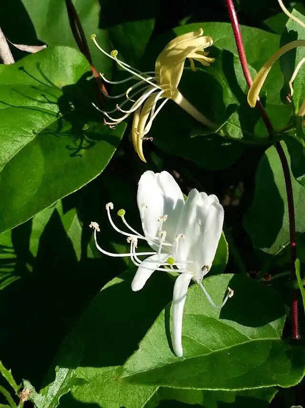 金银花非常容易扦插,而且她的枝条柔软多节,落地生根,蔓延生长 , 密密匝匝 , 挤得野草无处落脚。庭院角落 , 割草机不到的地方 , 正好可以让金银花来填空落草。