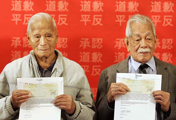 2006年在温哥华在“人头税”赔偿金发放仪式中,97岁的Thomas 宋 (左) 和99岁的查尔斯.孔手持政府支票。(CP P HOTO/Lyle Stafford)(更多信息请查询http://www.ccnc.ca/redress/history.html)