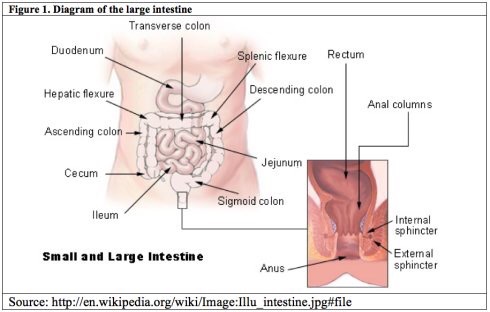 人类大肠示意图,约1.5米,因身高及性别不同有所差异。大肠包括:升结肠(Ascending colon),横结肠(transverse colon) ,降结肠 (descending colon),乙状结肠(sigmoid colon),及直肠(rectum)。