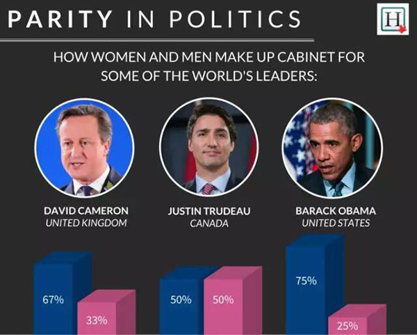 自1916年女性取得投票权后,“平权内阁”的出现在加拿大尚属首次。而在此之前,法国、意大利、及北欧国家,都曾出现过“平权内阁”。在去年“国际国会联盟”(International Parliamentary Union)女性代表政府排名中,加拿大也并不靠前,在190个国家中排名第50。