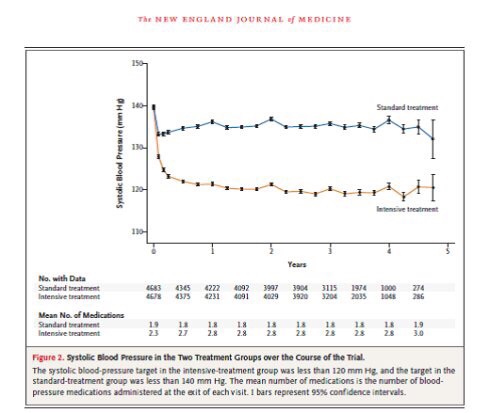 再有,研究人员承认把中老年人的血压控制在120以内非常困难。从第二张图不难看出,激进治疗组的平均血压为120,这意味着尽管在这种严格实验干预的情况下,约一半的人还是达不到收缩压低于120的目标。