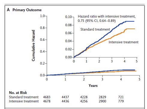 以心肌梗塞,脑卒中等指标进行风险分析的结果。 由图可见激进治疗组(橙色线)最初与普通治疗组无区别,但随着时间的推移,两条曲线逐步分离。 激进治疗组风险明显低于普通治疗组。两条曲线的末端的平台是假设结果,因为效果明显实验提前停止,无法也没必要再获得真实数据。