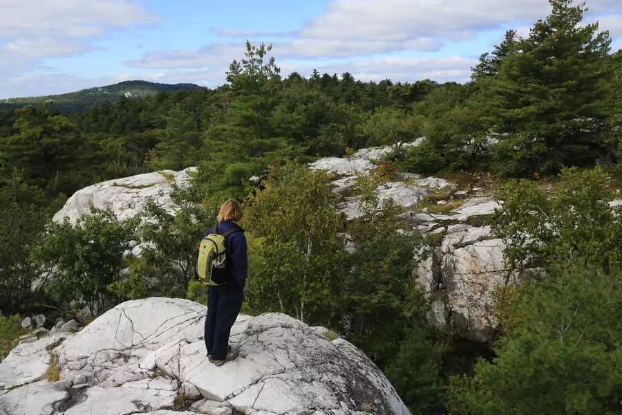 出发时我们带上了午餐,纸袋里汉堡、苹果和一瓶水。在林间行走无疑是惬意的,所谓的森林浴就是这样吧,人和树木一样吐纳着,踩着青草和腐殖质的黑土,随处可见的蘑菇,松鼠,还看到一只横过小径的毛皮鲜亮的火红狐狸。树上每隔十几米就有红蓝箭头指示方向,代表不同路线,不必担心迷路,从林间到湖边又从湖边到林间,线路曲折,林间的尽头就是岩石,没有台阶要攀附而上,但并不难。这时候了解结实鞋子的用意,你需要保护脚底和脚踝。