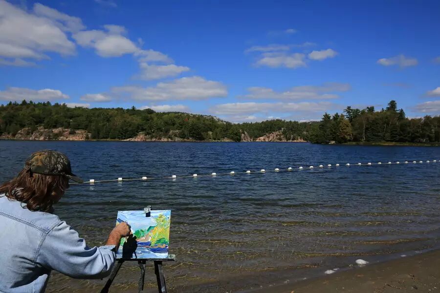 公园的风光被认为是典型的加拿大景色,以至于现在仍有很多人来此写生作画,碰巧我们就遇到了小有名气的画家Pierre Sabourin,他在此作画出售,同时也办学画班。这位老兄长得孔武,不修小节,有常年独自生活所带来的拘谨以及过度热情,他教我们在湖边做画,并给予了很高的评价,他是个好老师。后来我们还去了他村里的家参观,堆满了用于销售的作品,墙上家具上到处贴满了圣经诗句和自勉格言,独身的他像是在跟自己战斗。循着七人画派的画风,他的画也是用高纯度的色彩表现风景,内容简单,装饰性很强。