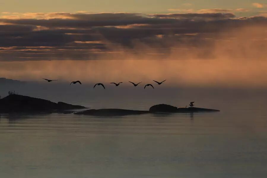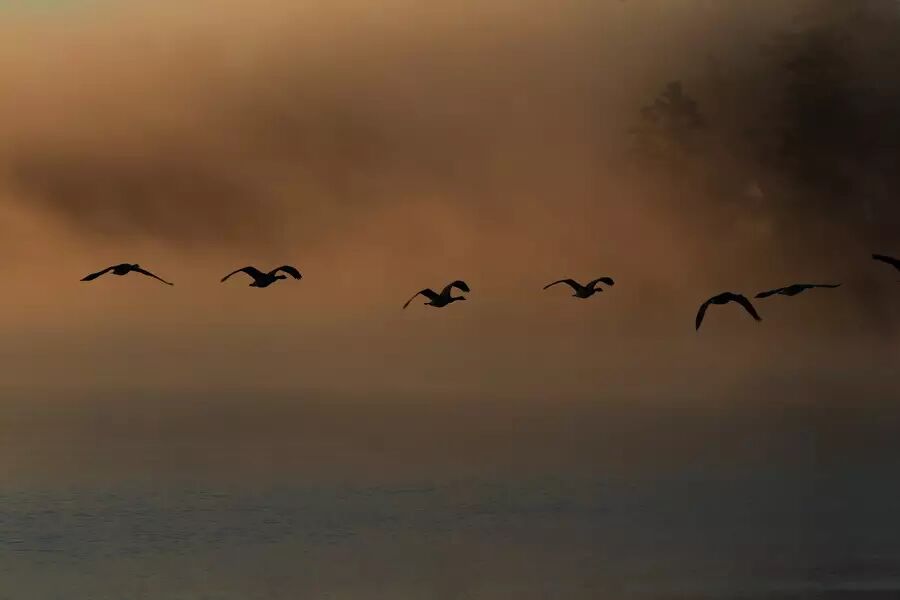 晨起,在床上就看到远处有薄雾,走出去一看,以为自己是在梦游,水面上一层缓缓移动的雾气,被初升的太阳照出一片金黄,很像电影魔戒里的精灵城堡,影影绰绰中不时飞过一群排成人字形的大雁,鸣叫着在空中划过。