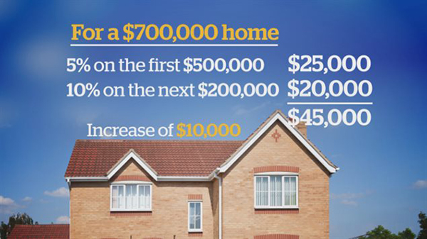 比如,你买一栋70万的房子,50万以下的部分,需缴纳5%首付,也就是25,000加元,而从50万到70万,你需要缴纳10%,也就是20,000加元。总共的首付应为4万5千加元,比目前的政策多缴纳1万元。