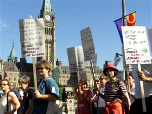 加拿大最大的公务员工会——加拿大公共雇员联合会(PSAC)在2014年3月向安大略省高等法院提交了诉讼状。起诉书中说,政府以公共服务部门是要害部门为由,禁止公务员罢工,是违反《人权宪章》的,应该取消。起诉书要求法院宣布其无效,并在此基础上要求政府重开与工会谈判的大门。工会的诉讼状中提到,原来的有关如何确定哪些部门是要害部门的程序规定比较合理,而且运作良好。修改后等于否定了工会会员集会和罢工的基本权利。
