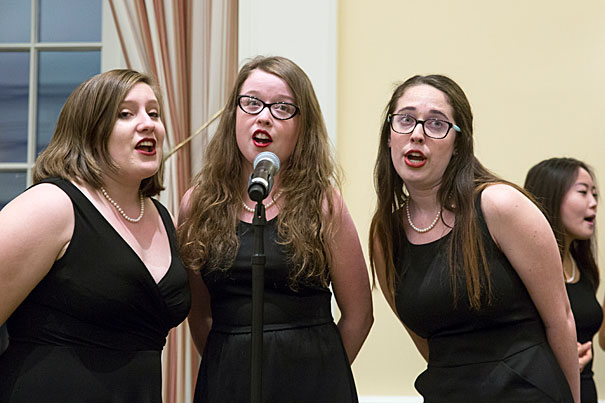 The Radcliffe Pitches serenade the inaugural Women’s Weekend attendees. Jon Chase/Harvard Staff PhotographerFaust recalled that more than a century ago,
