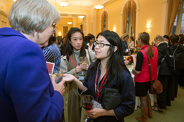 President Drew Faust speaks with Rebecca Woo ’89 (center) and Theresa Loong ’94 before making welcoming remarks at the inaugural Harvard Women’s Weekend. Jon Chase/Harvard Staff Photographer