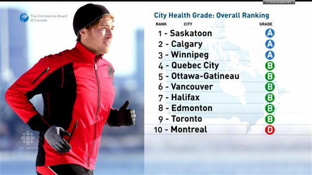 而评比的结果显示,有三个城市公民的健康表现获得分数最高,属于A级。萨斯卡通由于在人口健康和生活方式方面的满意度最高而排名第一。
