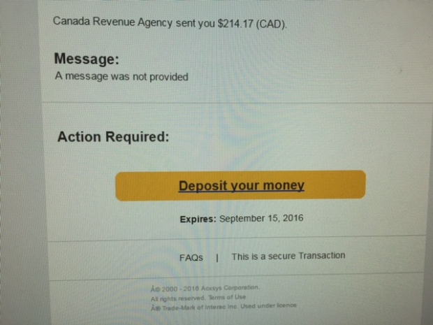 CBC记者Yvonne Colbert报道说,去年9月初,布莱德利通过电邮收到“加拿大税务局”的一笔电子转账退税。他不疑有诈,选择了把钱存入账户(Deposit your money)。一个多月后,他发现有人从他的账户里转走了3000加元。他立刻给银行客服打电话,对方表示会马上处理。