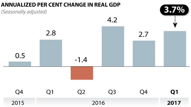 根据加拿大统计局的统计,2017 年前 3个月,加拿大经济增长了 3.7%。