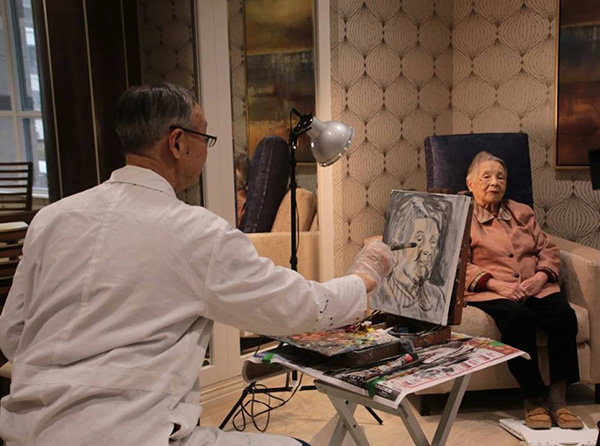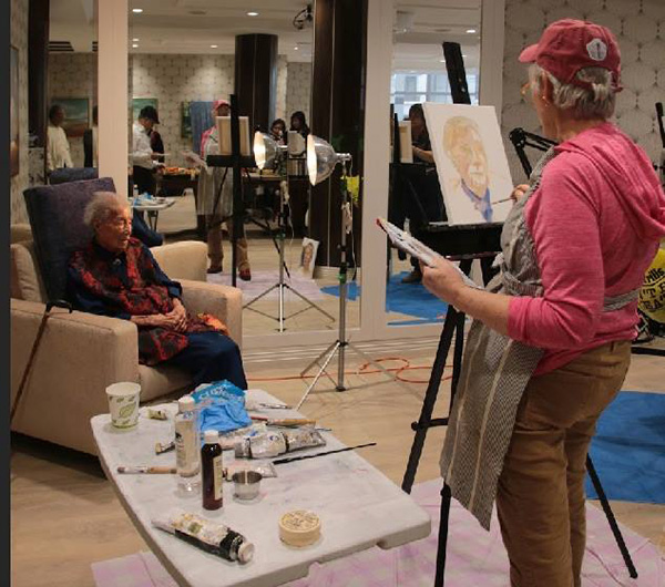 我们安排八位耆老和一位中年女士,老人家平均年龄超过九十岁。所以我建议,两位艺术家画一位模特儿,一位画正面,一侧面,平均大约一个半小时。每隔二十分钟休息五分钟。画家只做短暂休息,连画三位,从早上十点到下午五点。回去画室后再依现场留影照片稍加修饰完成全画。一个宽敞明亮的场地和美味不断的餐点,陪伴老人家同来的家属与来捧场观摩的朋友,让现场气氛溷合着安静严肃和愉快欢乐!