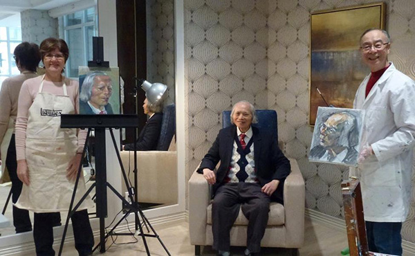 (Linda Chen脸书2017年2月12日帖文)多伦多”台湾青籐耆老喜福会人像画”筹划了两年,终于在二月十日与“Painters6六人画会”配合,顺利进行,圆满完成! 这个活动,两年前即在(台湾社区的)明珠(Pengmila)的脑海裡萌芽,想为自家及台湾社区裡的老人家画人像。这期间与我谈她的梦想,但时候不成熟无法落实。去年底,她带了一群老人家看过我们“六人画会”的小型画展后,我们打了数不清的电话, 密集讨论与策画。过程中要联络及安排的人事地物繁琐,加上她临时需要远行,我们又改期,更在近来风雪交加的气候下,战战兢兢地祈祷,希望别出一丝差错。当上週五早,我们俩在画画地点扛东扛西进场时,非常地高兴。知道一个梦想终于要成真!