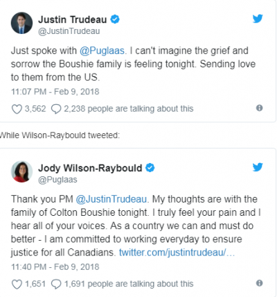 加拿大的政府官员很少就某一案件的裁决表达看法,因为那通常会被认为是干涉司法公正。而在上星期五陪审团对击毙原住民青年布谢的嫌疑人斯坦利做出无罪裁决之后, 总理贾斯汀·特鲁多和司法部长乔迪·威尔逊 – 雷博尔德都在社交媒体推特上对此裁决表达了关注。