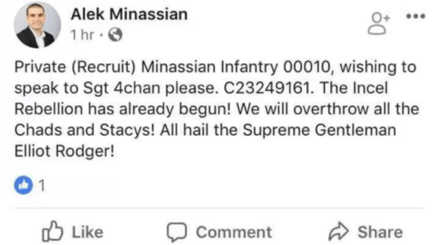 米纳希安的帖子:“列兵(新兵)米纳希安,陆军00010,希望和4chan [ 一个Incel论坛] 中士交谈。…… Incel 起义已经开始!我们将打倒所有的Chads和Stacys! 向至高无上的绅士艾略特.罗杰致敬!”脸书在得知此帖作者为撞人案嫌犯后第一时间将它删除。(Facebook)