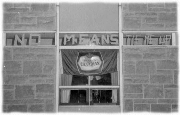 A taped sign seen outside a window at Queen’s University reads, ‘No means tie me up. (The Queen's Journal)