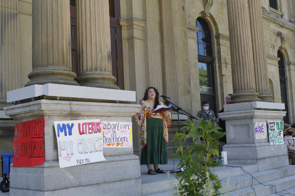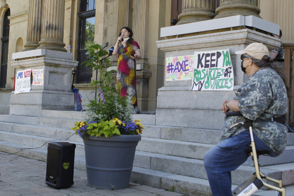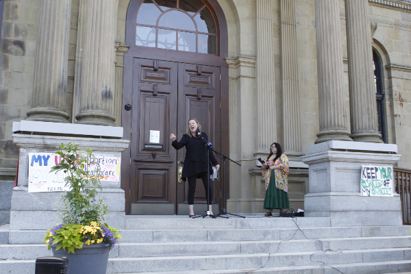 弗雷德里克顿百人集会要求更好的堕胎和2SLGBTQIA+健康服务,新不伦瑞克省新民主党执行主席Jennifer Stairs在集会上发言时愤怒质问:为什么我们如今仍需为了堕胎权而集会?Photo by Yafang Shi/Loving Sister (图:施雅芳/贴心姐妹网)