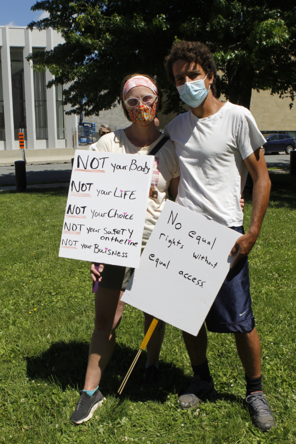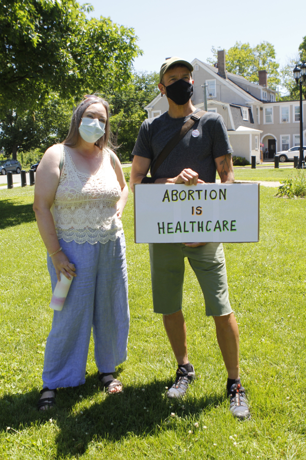 组织者说,这个集会是为了抗议美国高院取消对堕胎权的宪法保障,对酷儿社区的攻击,也抗议人们在新不伦瑞克省以及加拿大其他地区在获得堕胎服务上面临的障碍,以及2SLGBTQIA+在获得健康服务上面临的障碍。