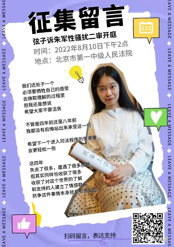 8月10日,弦子诉朱军性骚扰案二审开庭。我们发布网络留言墙,邀请大家写下自己想对弦子说的话。