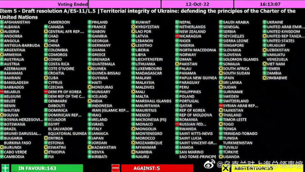 在参加投票的183个联合国成员国中有5个投了反对票,它们是俄罗斯、白俄罗斯、朝鲜、叙利亚和尼加拉瓜。中国、印度、伊朗和古巴等35个国家投了弃权票。