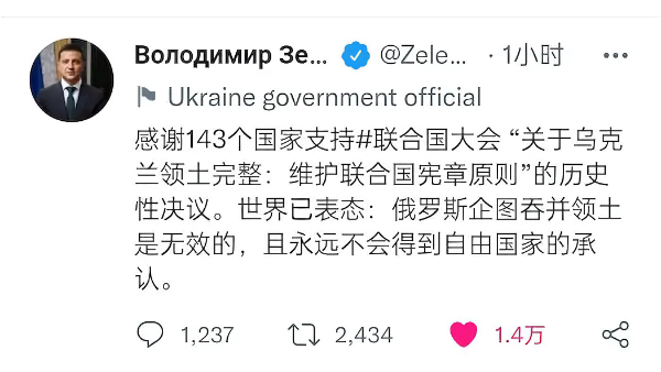 乌克兰总统泽连斯基在社交媒体上用包括中文在内的多种语言感谢143个投支持票的国家,并表示,世界已经表明态度,俄罗斯吞并乌克兰领土的企图是无效的,并且永远不会得到自由国家的承认。