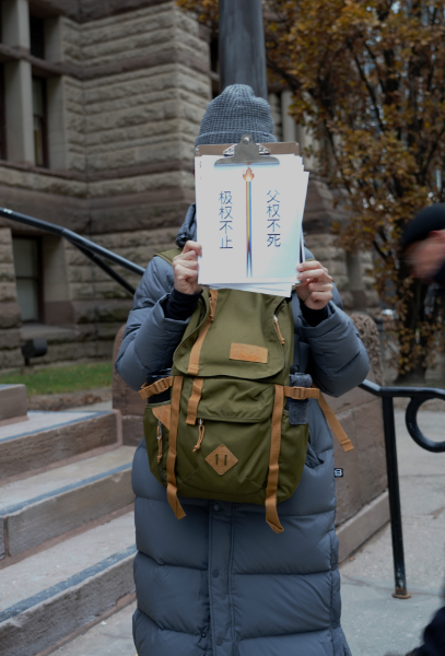 图:多伦多多个组织于12月10日国际人权日在多伦多老市政厅前联合举行“反专制,要自由”的集会。有集会参与者打出反极权和父权的口号。(Photo by Yafang Shi)