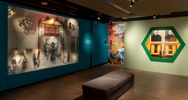 入口处的作品叫做《女英雄穿越险境的旅程》,以粤剧名伶红线女和任剑辉的唱段作为背景,传统戏曲中女英雄的剪纸从一幅1960年代蒙特利尔唐人街的旧建筑中显现。